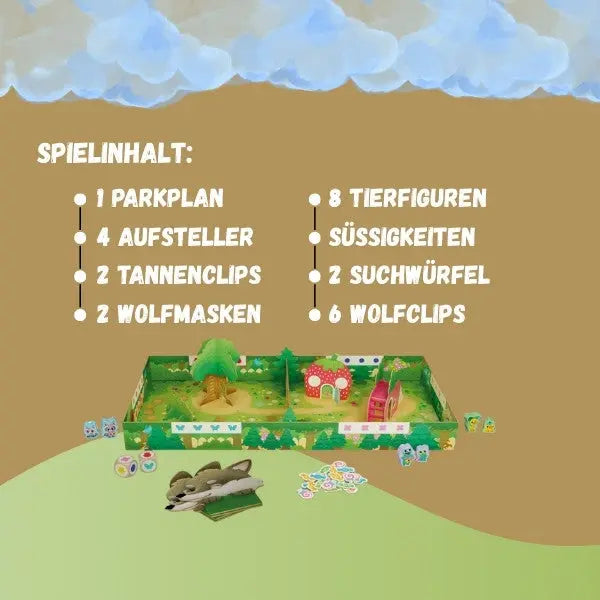 1 Parkplan, 4 Aufsteller (zum Aufbauen), 2 Tannenclips, 2 Wolfmasken, 8 Tierfiguren, Süßigkeiten, 2 Suchwürfel, 6 Wolfclips, Anleitung