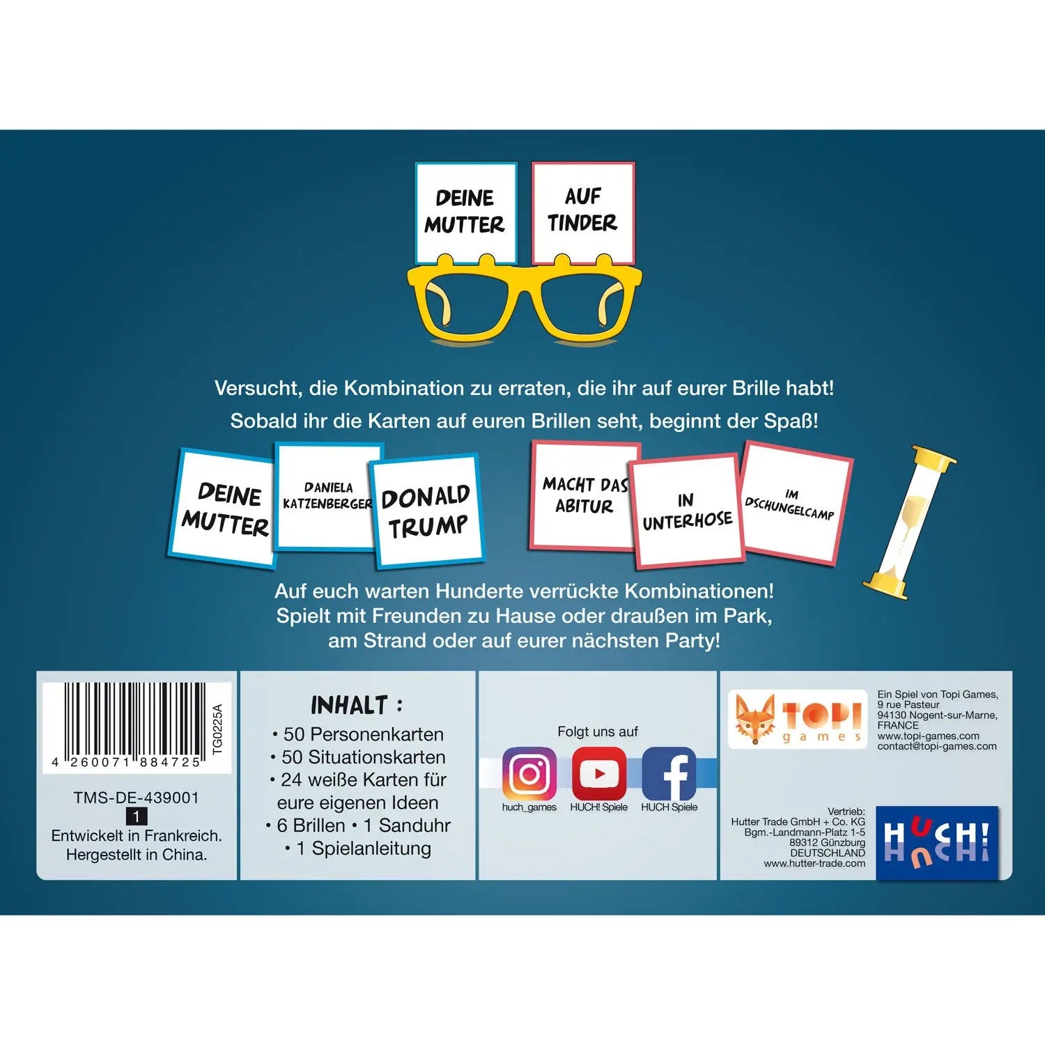 Kannst du erraten, wen du auf deiner Brille hast? Ist es Taylor Swift in einem Kloster, Donald Trump beim Oktoberfest oder doch einfach nur deine Mutter in Unterhose? Du darfst nur „Ja/Nein“- Fragen an die anderen stellen und musst so auf die richtige Lösung