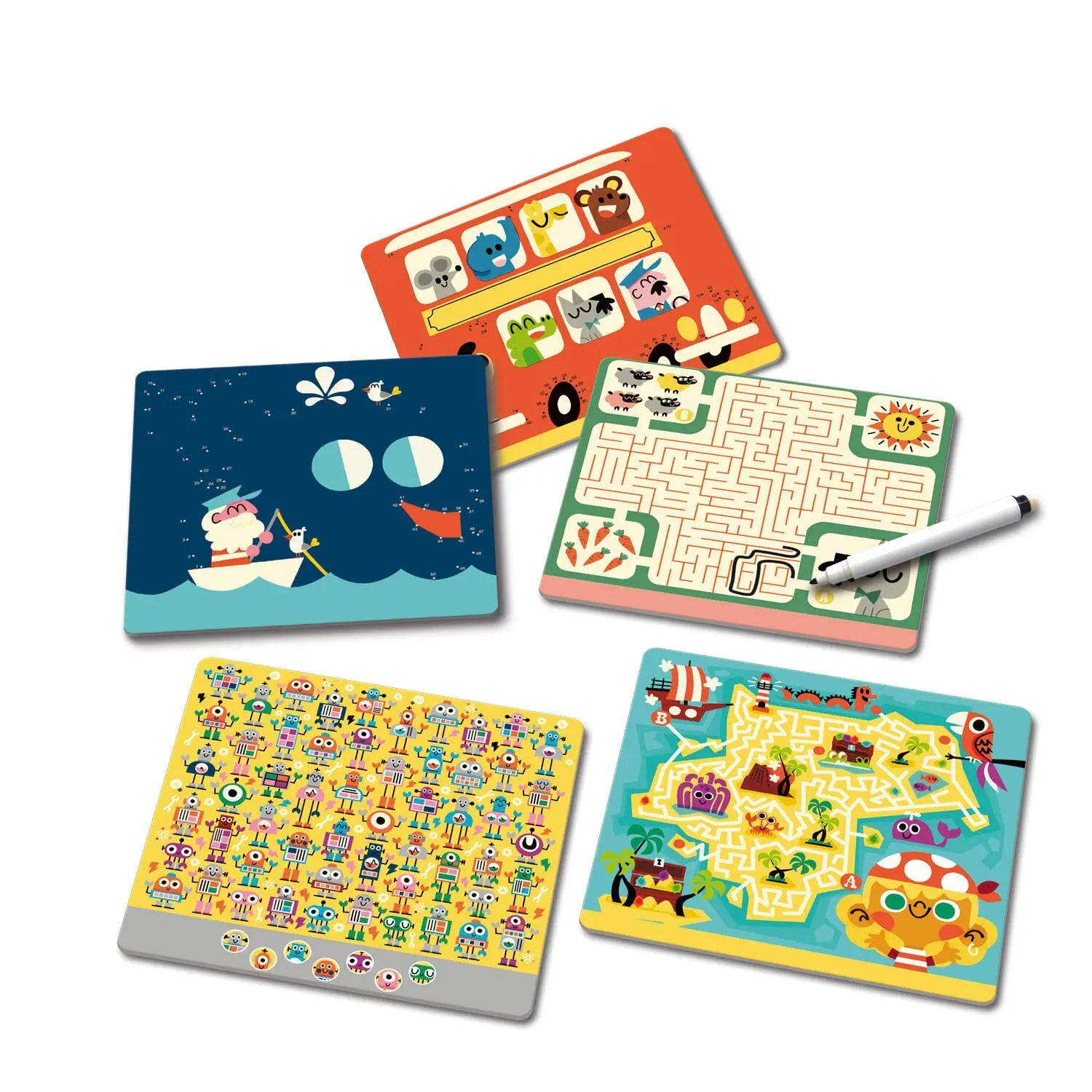 Geh auf Entdeckungsreise und erforsche unterschiedlichste Welten! Auf der Vorderseite der Karten findest du Labyrinthe, Suchbilder und Von-Punkt-zu-Punkt-Rätsel. Die Rückseiten kannst du zu einem großen Suchbild zusammenlegen! Die Karten sind abwischbar, so dass du Rätsel immer wieder neu machen kannst.