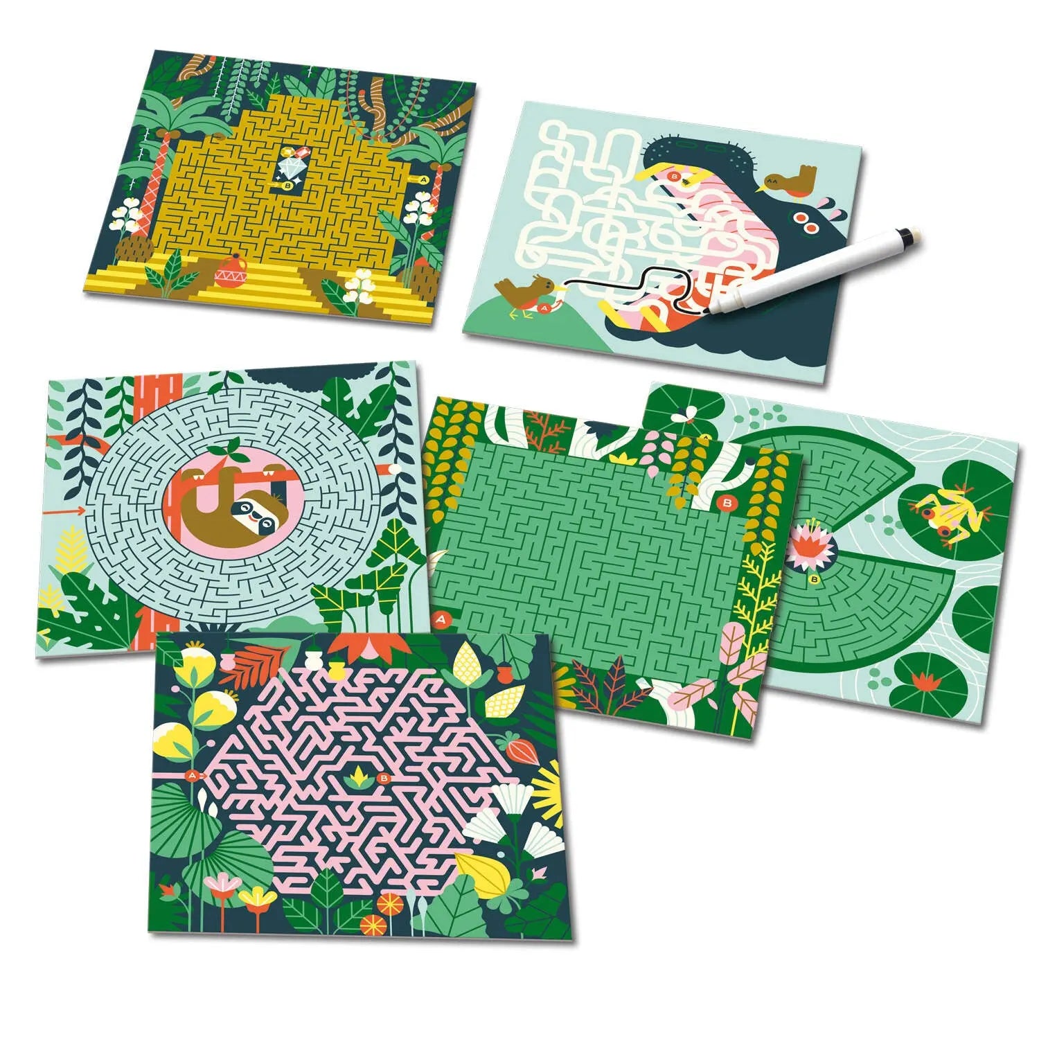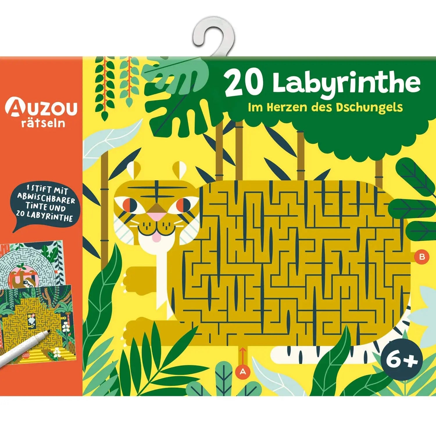 Geh im Dschungel auf Entdeckungsreise! Auf den Vorderseiten findest du 19 Labyrinthe zum Lösen und mit den Rückseiten kannst du ein Riesenlabyrinth zusammenlegen!