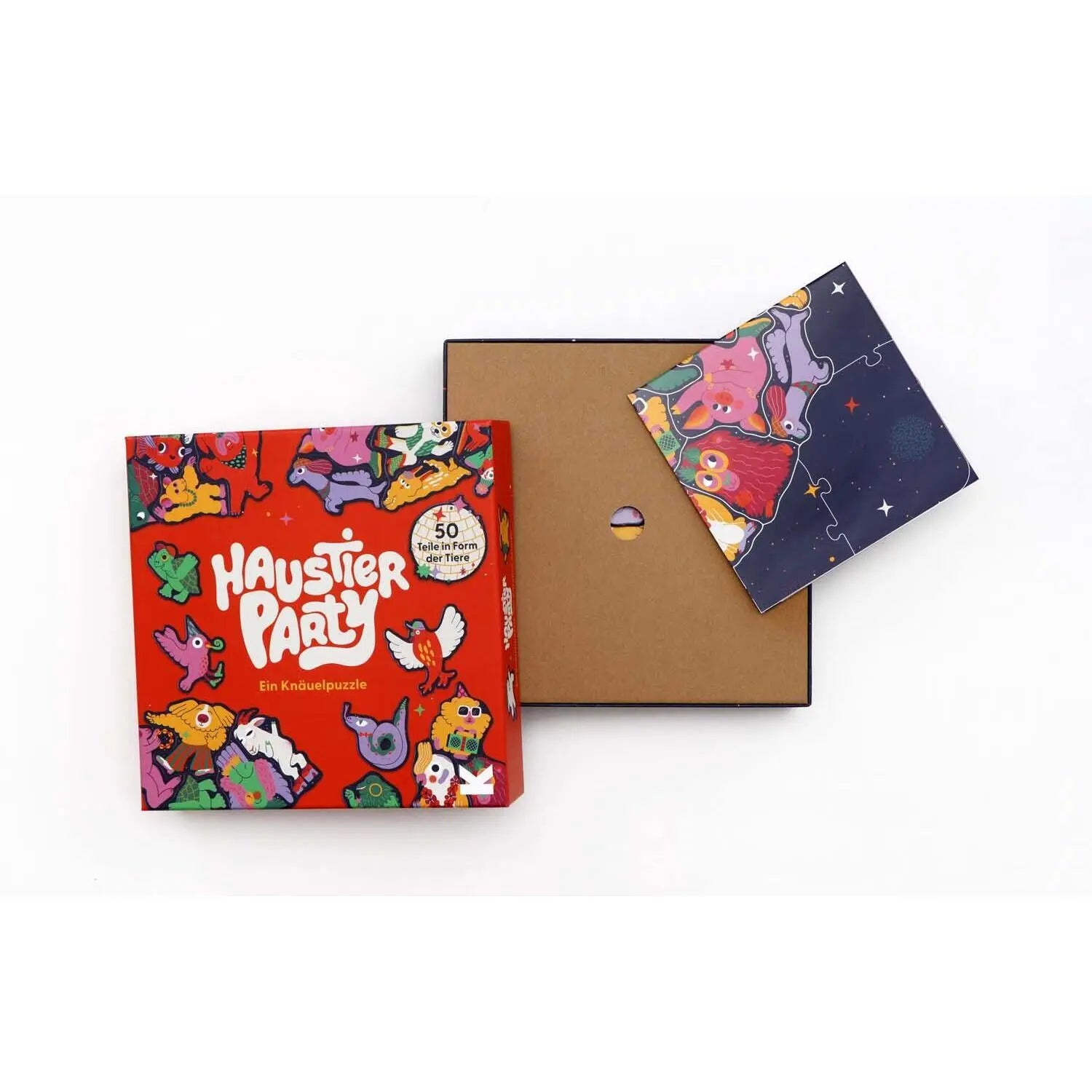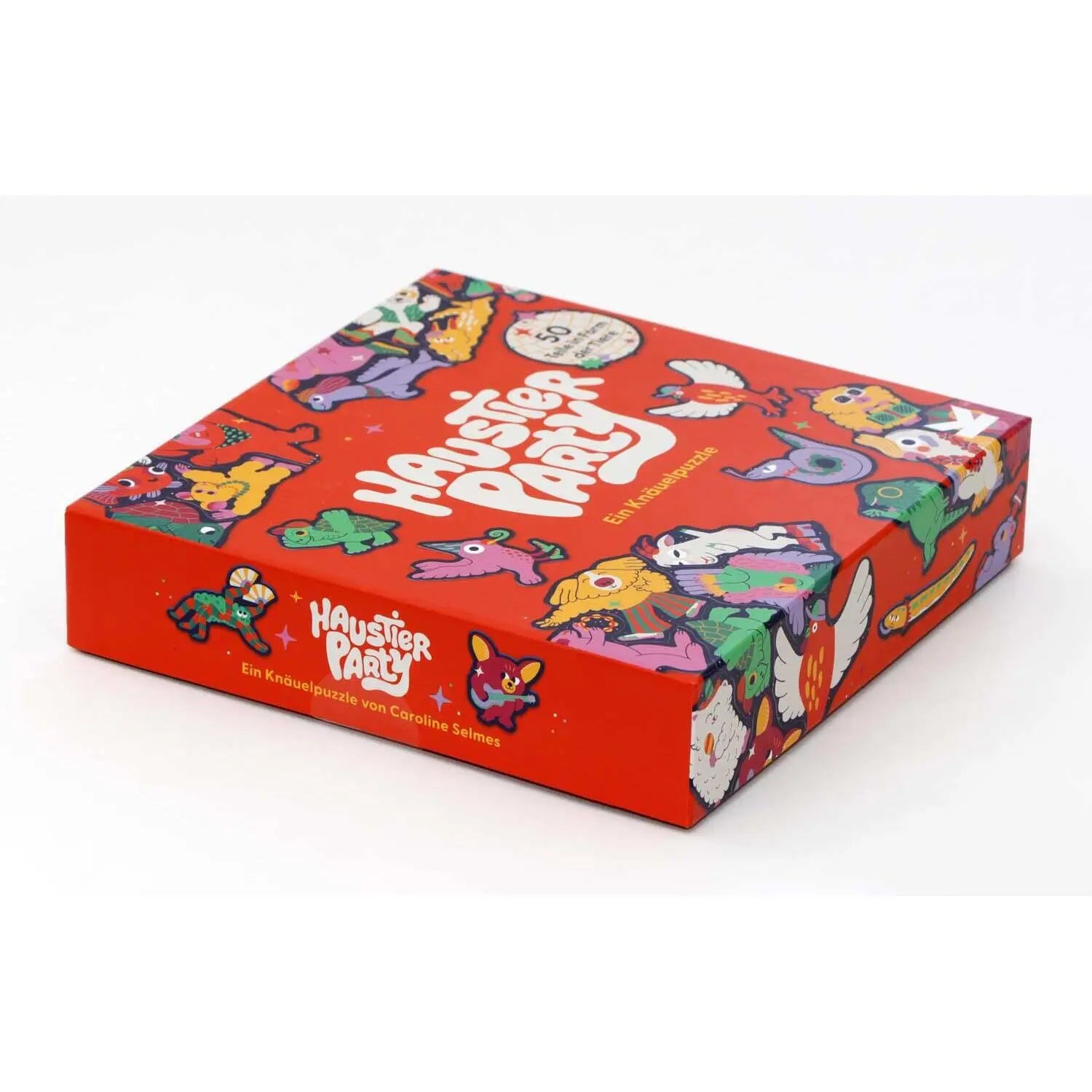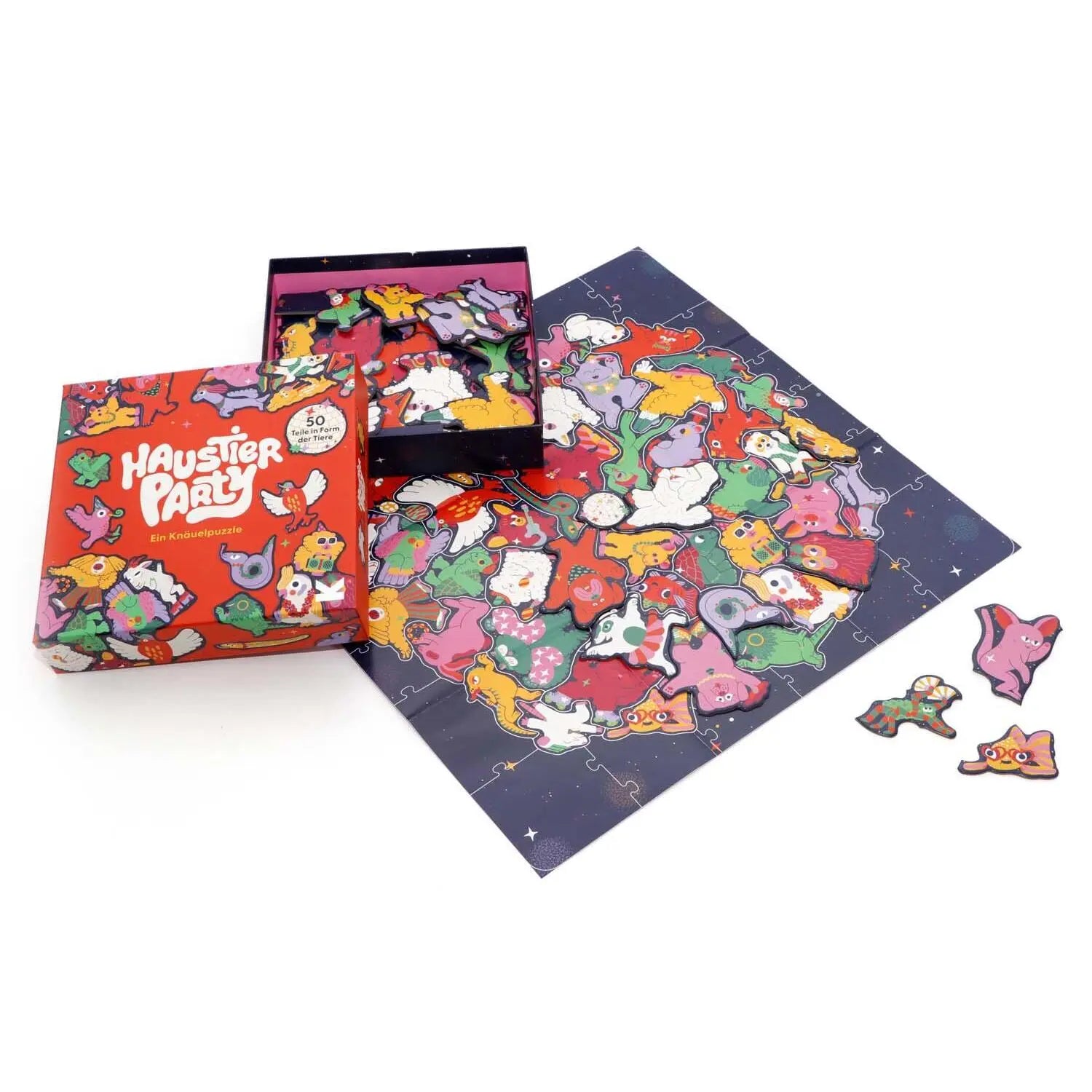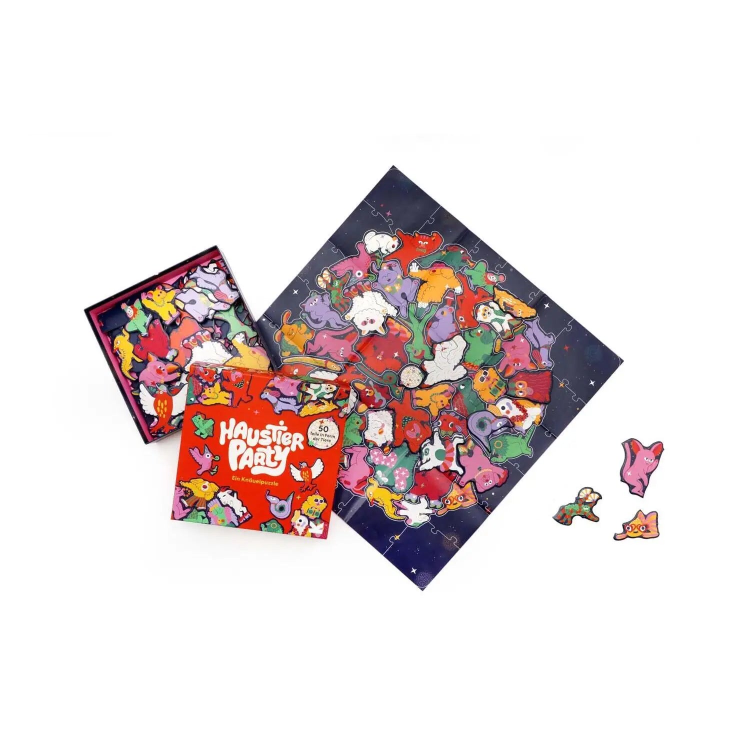 Hier geht die Post ab! 50 Haustiere feiern eine Party und jedes Puzzleteil hat die Form des jeweiligen Tieres. Ein Rahmen hält die große Sause zusammen und erleichtert das Puzzeln. Könnt ihr die glitzernde Discokugel zwischen den Haustieren entdecken? Partyhut nicht vergessen!