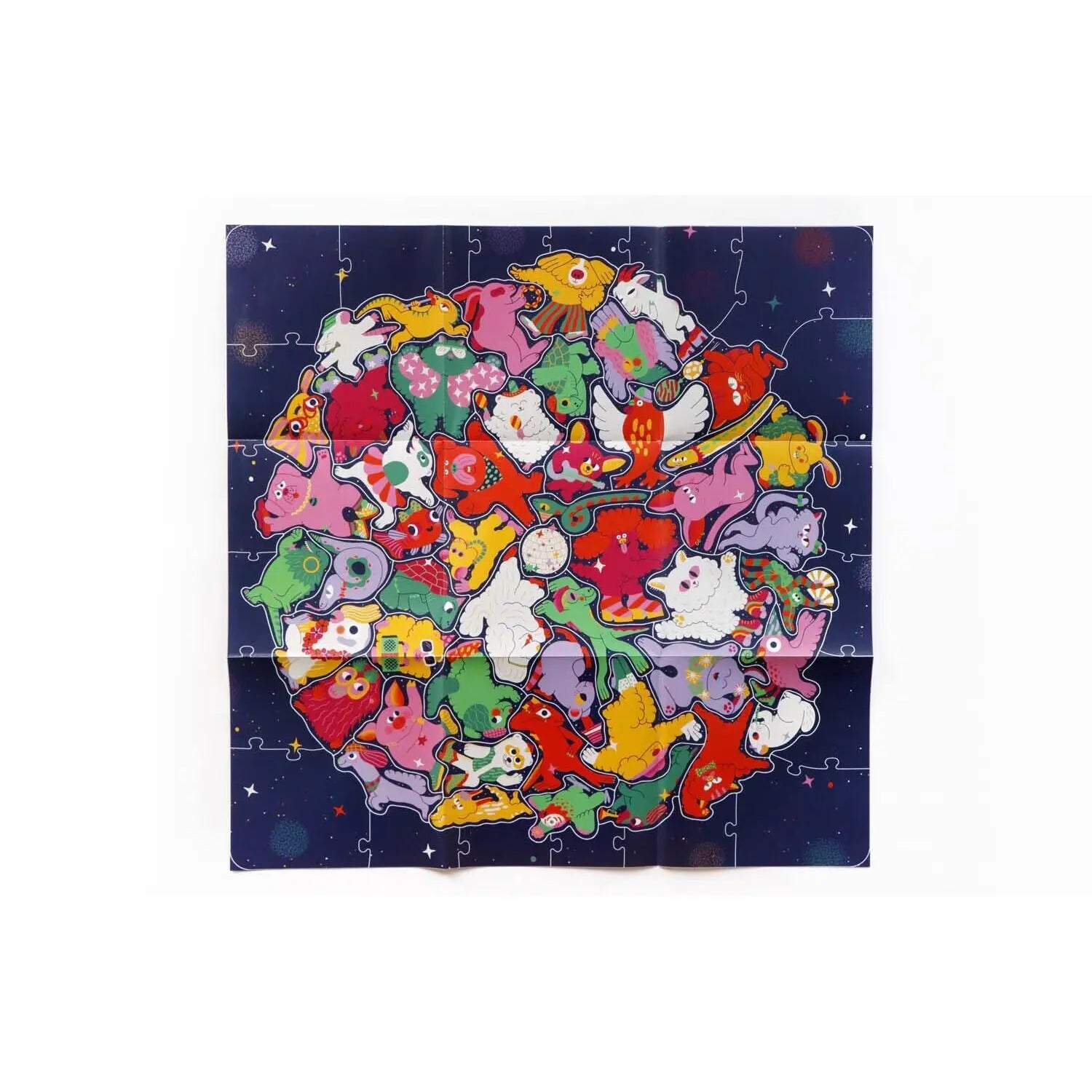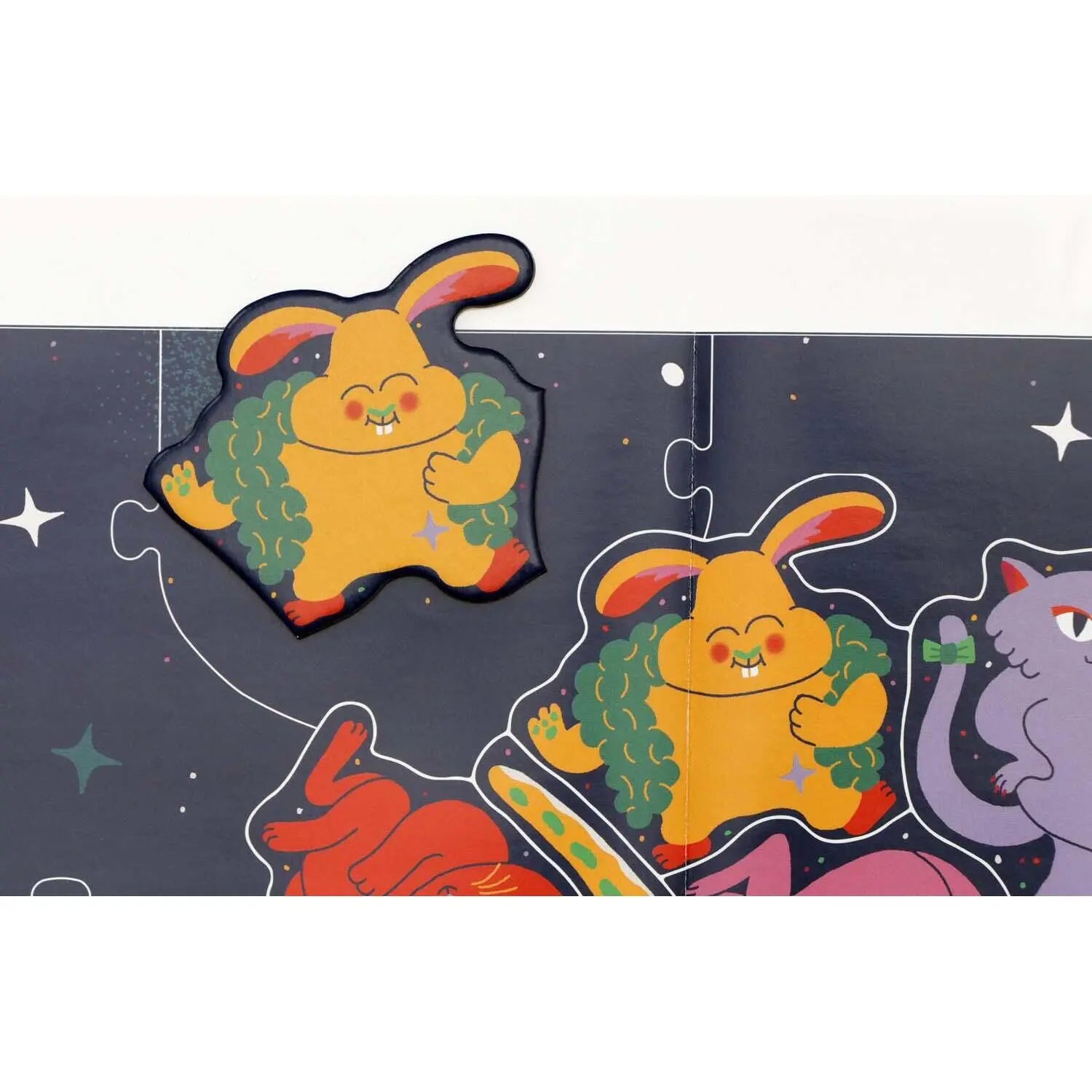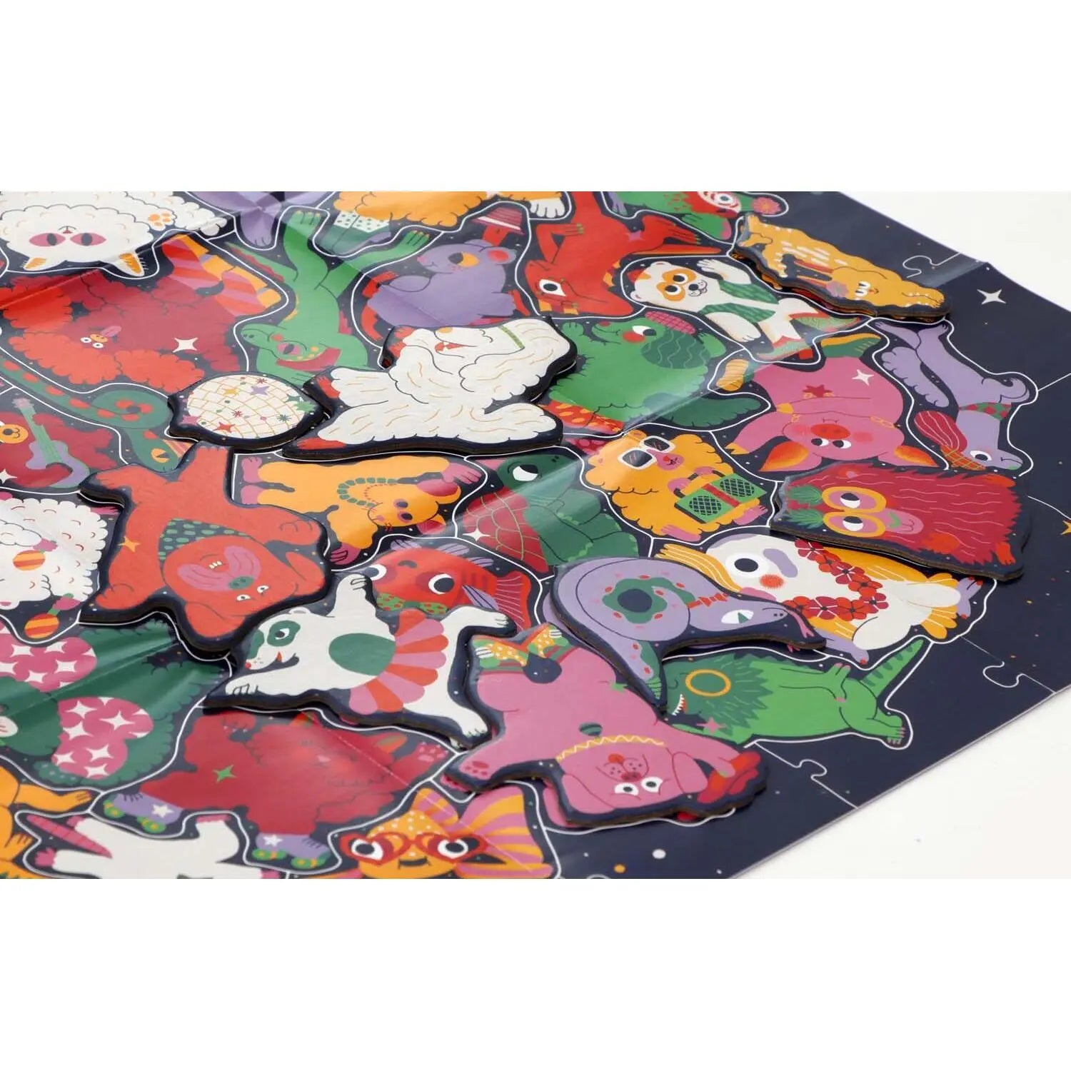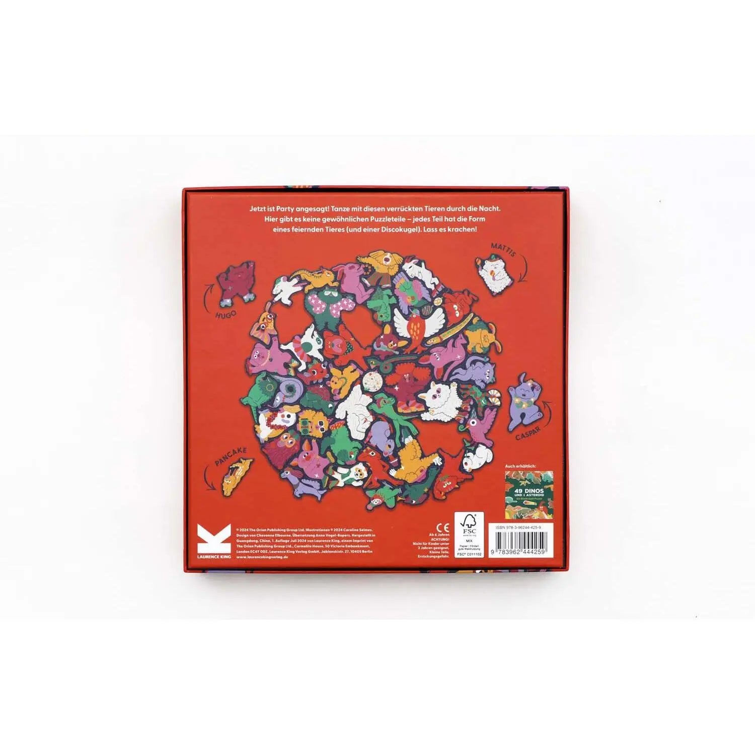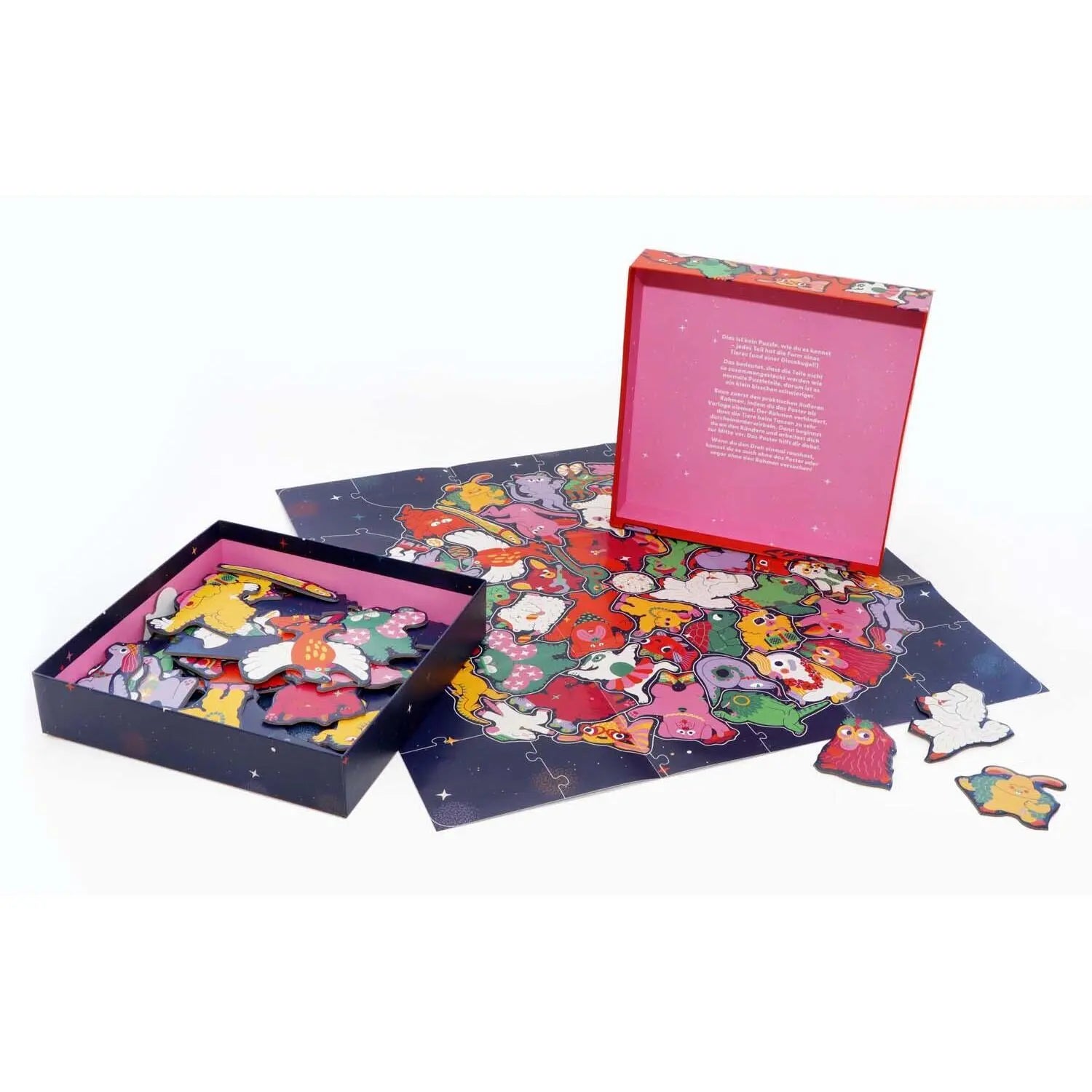 Hier geht die Post ab! 50 Haustiere feiern eine Party und jedes Puzzleteil hat die Form des jeweiligen Tieres. Ein Rahmen hält die große Sause zusammen und erleichtert das Puzzeln. Könnt ihr die glitzernde Discokugel zwischen den Haustieren entdecken? Partyhut nicht vergessen!