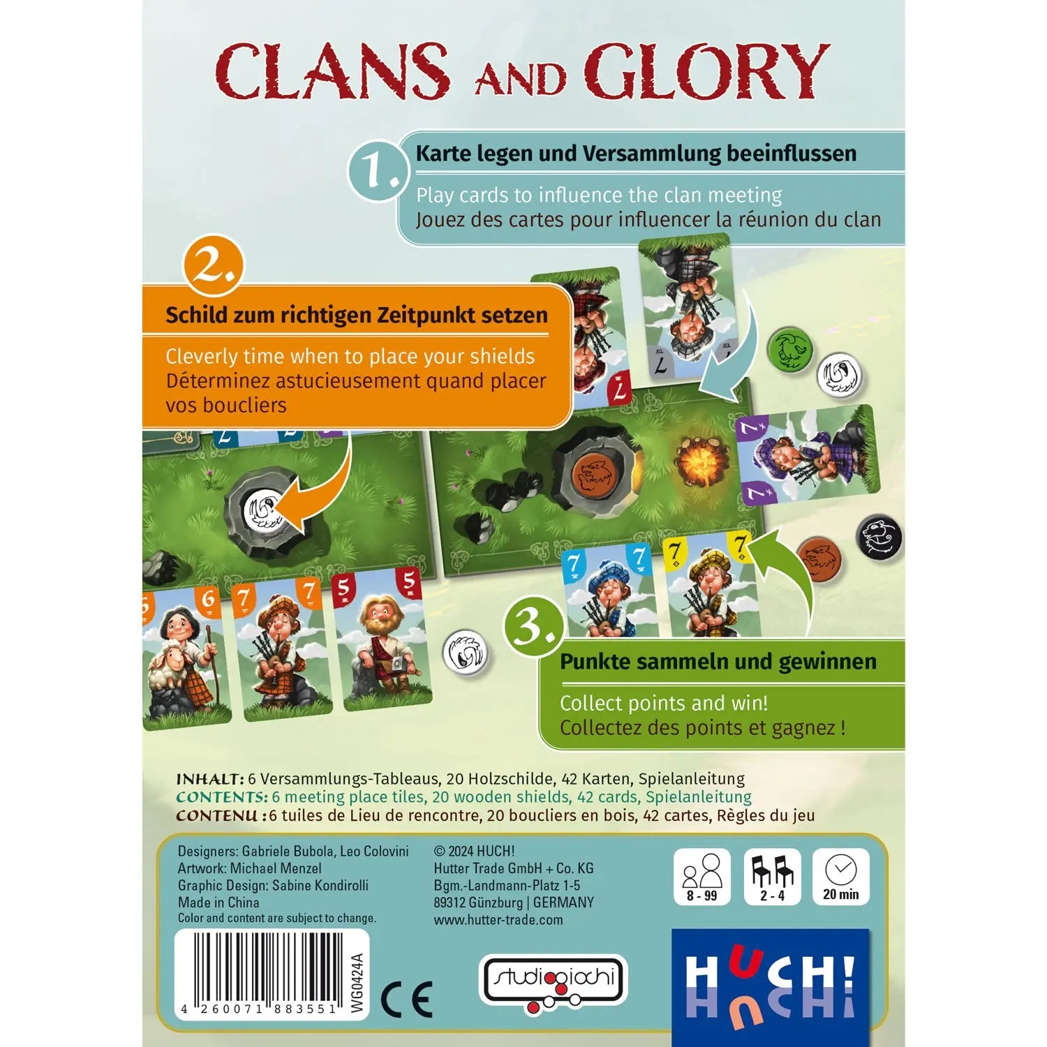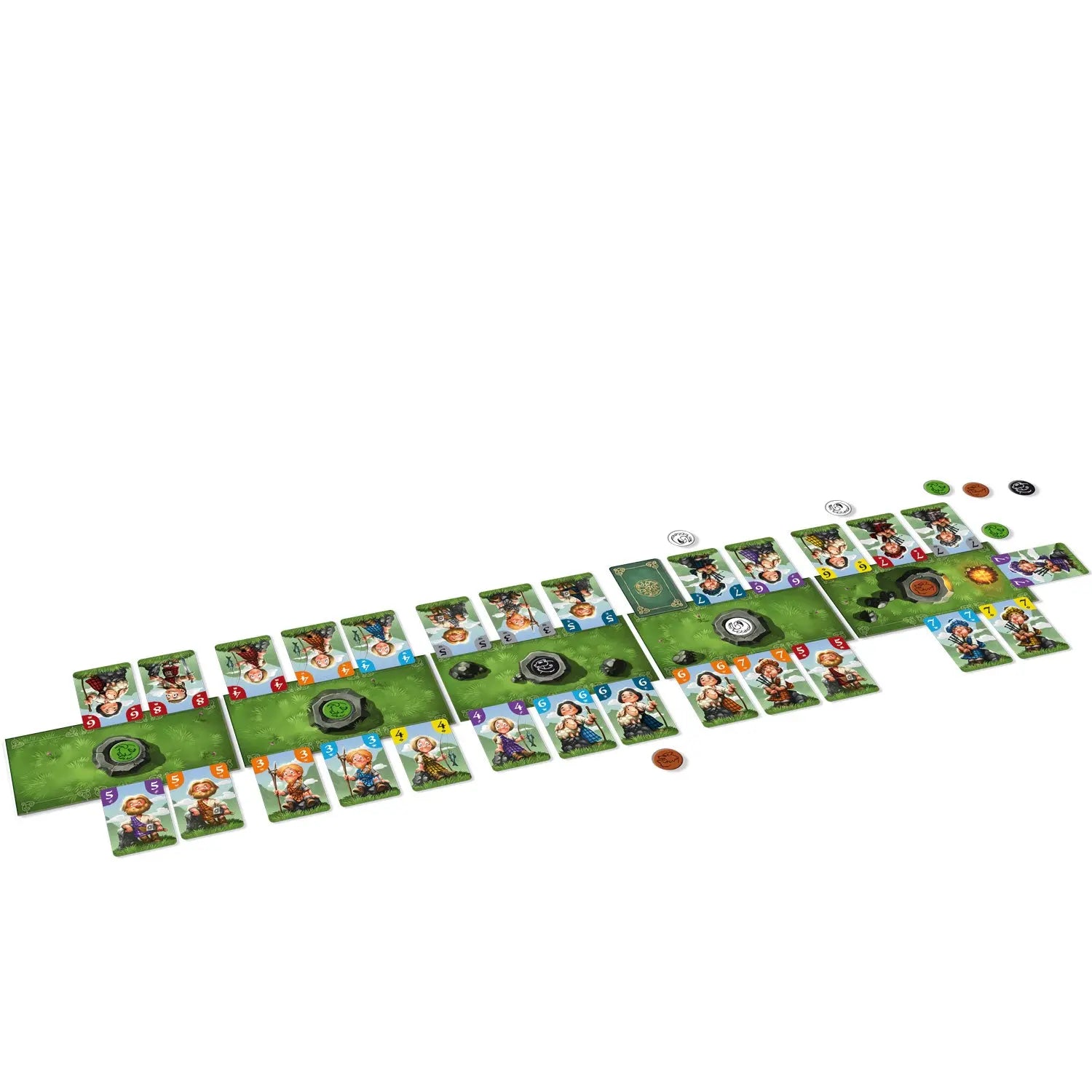 In Clans and Glory nimmst du an einem uralten Ritual teil: Von nah und fern sind die freien Völker der schottischen Highlands zum Versammlungsplatz gekommen, um sich einem Clan-Chef anzuschließen. Schaffst du es, die besten Gefolgsleute für dich zu gewinnen? Stelle dir den stärksten schottischen Clan zusammen - durch cleveres Kartenlegen und geschicktes Planen!