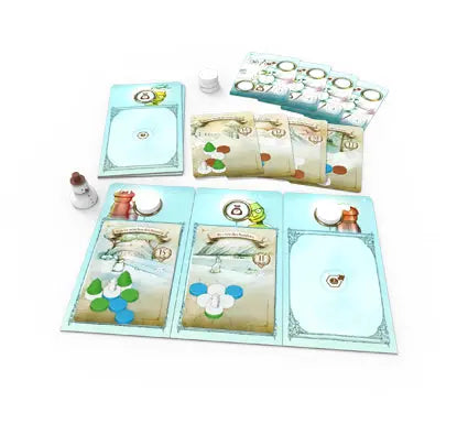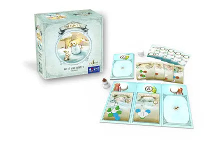 - Inhalt1 Schneemann, 10 Schneekarten, 5 Schneetableaus, 5 weiße Splitter, 2 Traumzielplättchen, 1 Anleitung